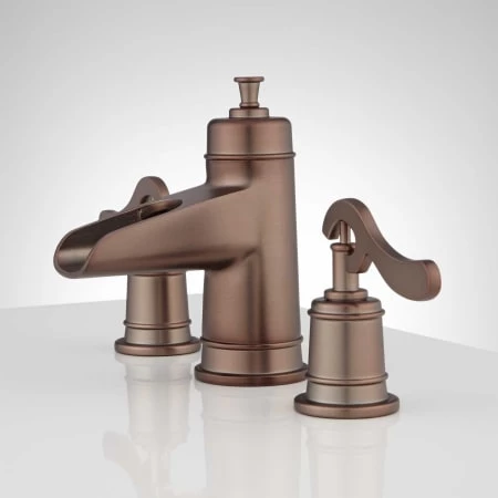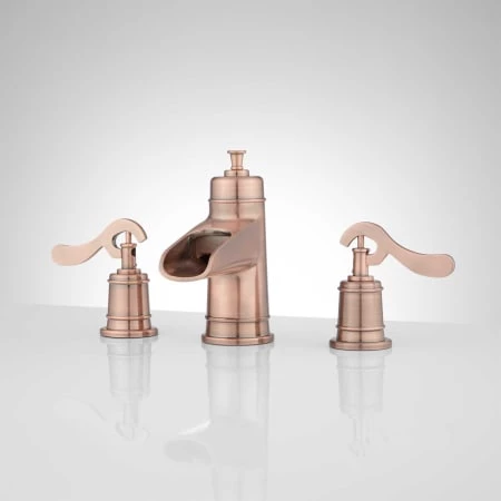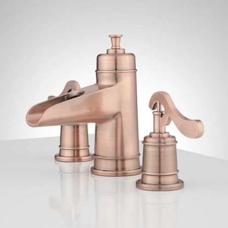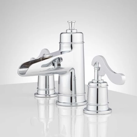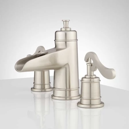 The Melton Widespread Bathroom Faucet features vintage-inspired accents. Crafted of solid brass, this product has a waterfall design that gracefully releases water into your sink. Sloped, thin handles enhance the Melton’s unique style and provide embellishments not seen in standard bathroom faucets.