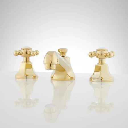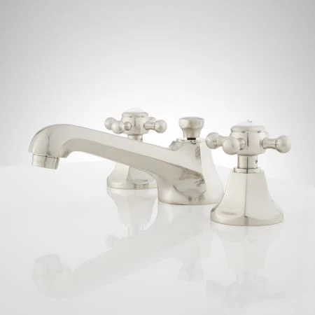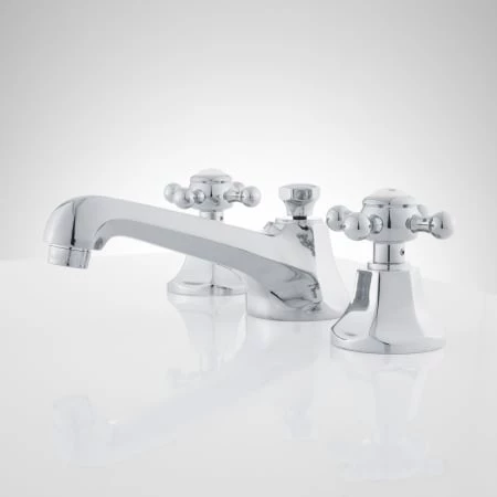 This widespread lavatory faucet features cross handles with porcelain insets and has adjustable centers for maximum flexibility.