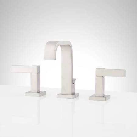 Add modern flair to your guest or master bath with the Rigi Widespread Bathroom Faucet, featuring a flat gooseneck spout and squared details. Made of solid brass, this faucet boasts a premium, metallic finish that will resist rust and discoloration. Comes complete with a matching pop-up drain for a finished look.