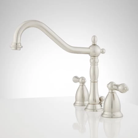A curved, shapely spout and a decorative riser give this lavatory faucet an authentic vintage feel. Faucet feature sculpted metal lever handles.